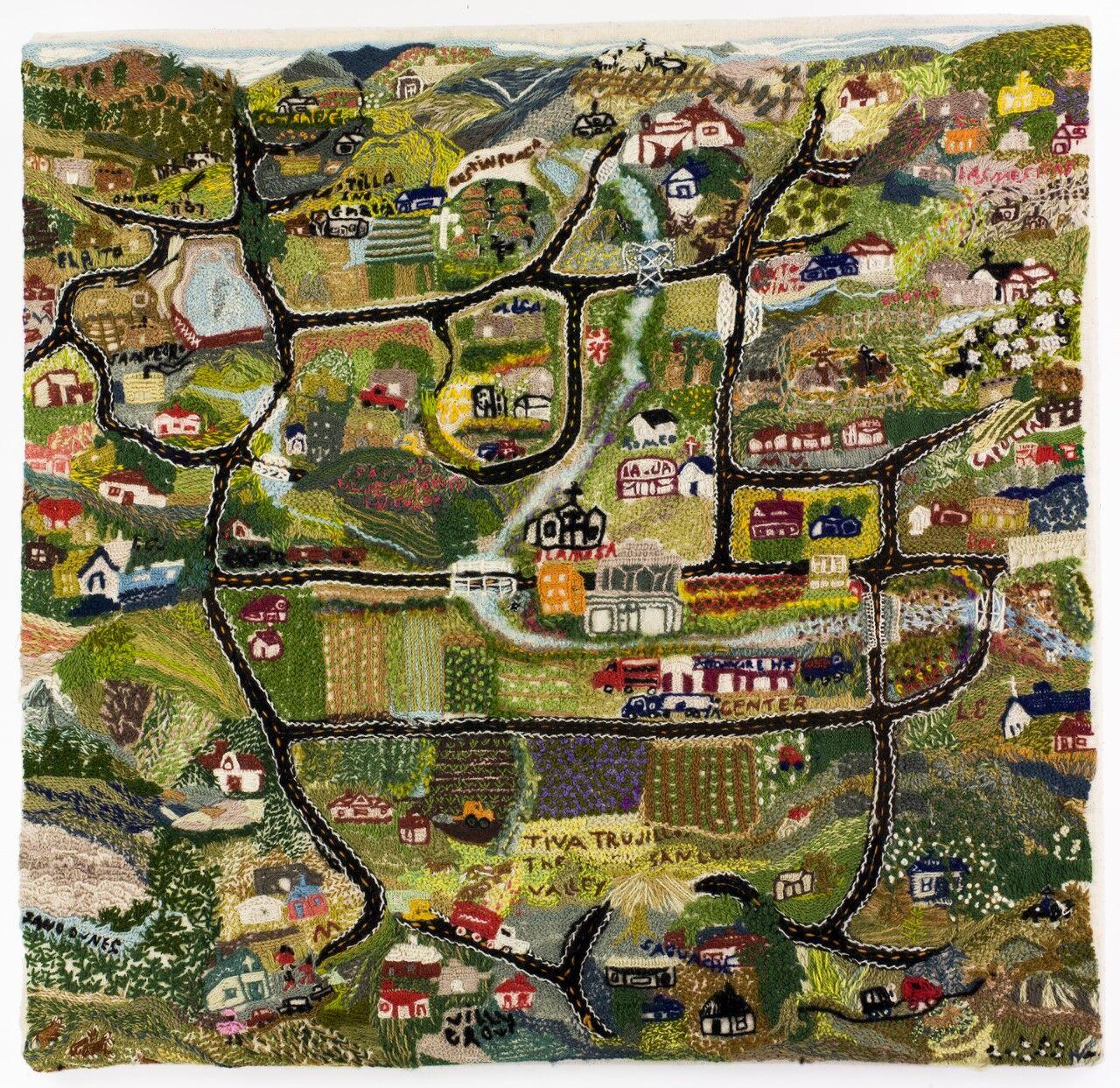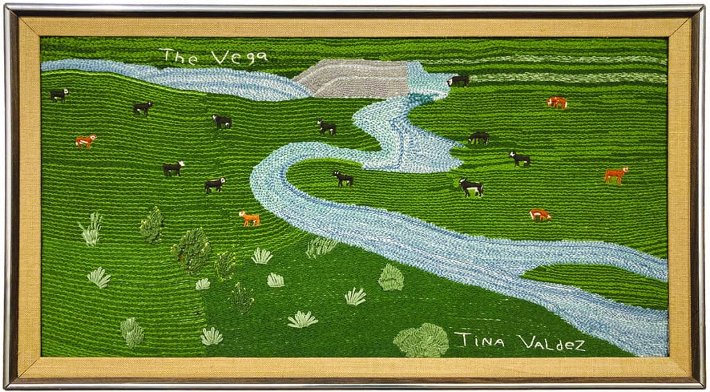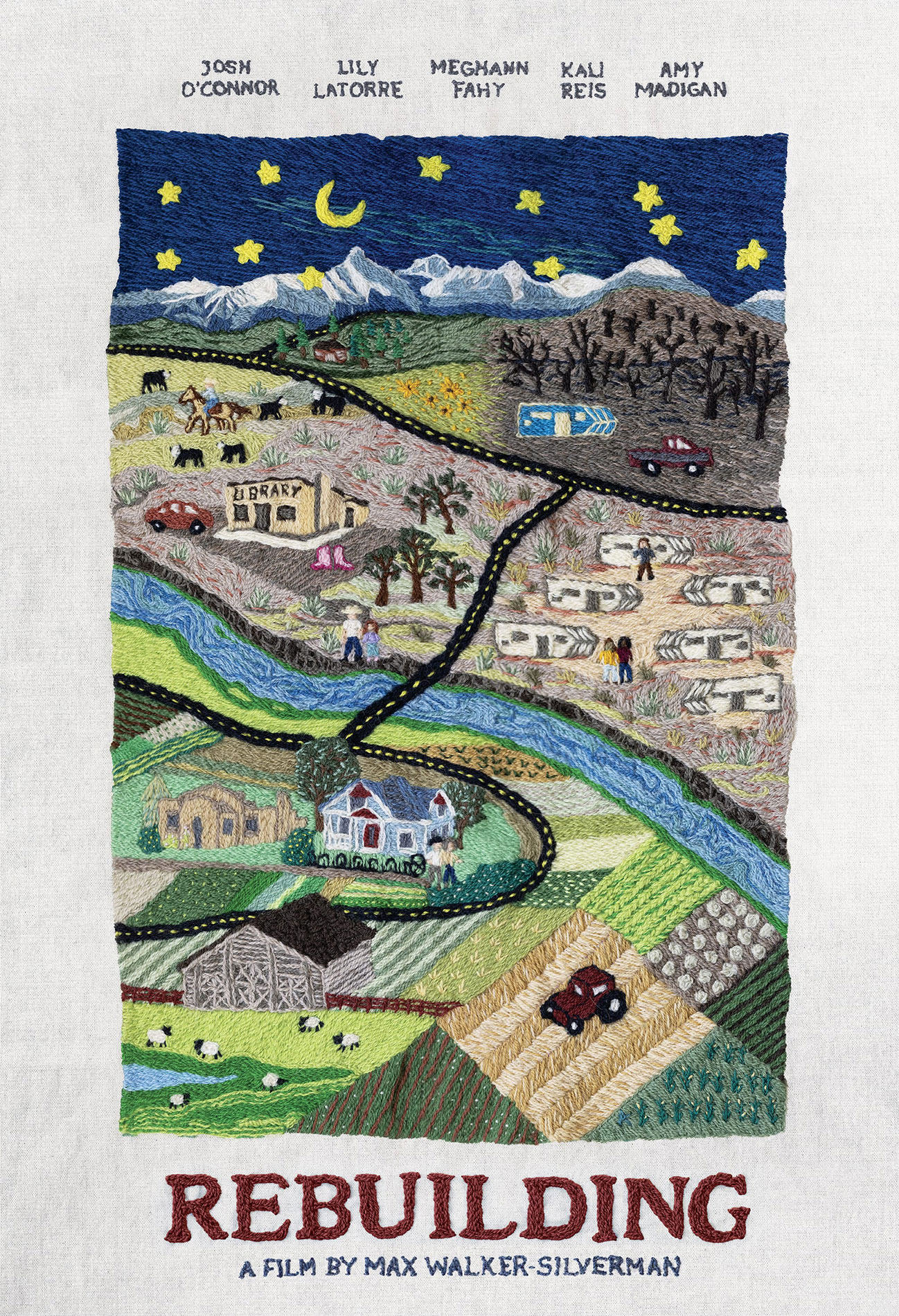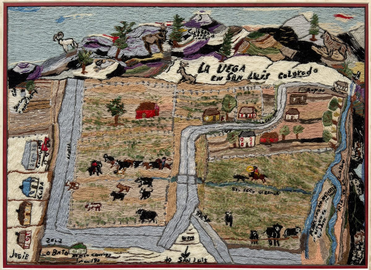 When I was a kid I would watch my great-grandmother on her couch, carefully sewing yarn through a flour sack on her lap, telling a story stitch-by-stitch. I later learned this was called colcha—an embroidery practice that migrated to Colorado's San Luis Valley in the 19th century from Northern New Mexico. Over time, this folk textile evolved through revival movements into narrative forms imbued with personal symbolism. Rebuilding, which I co-produced, was brought to life in the San Luis Valley, where my family has ranched for eight generations. At its core, this film is about community—much like the colcha embroidery tradition that continues in the region today. I created this piece to reflect the collaborative spirit of the film and the local artists I engage with through the SLV Colcha Embroidery Project. You can learn more about the project at slvcolchaembroidery.org or @slv_colcha.