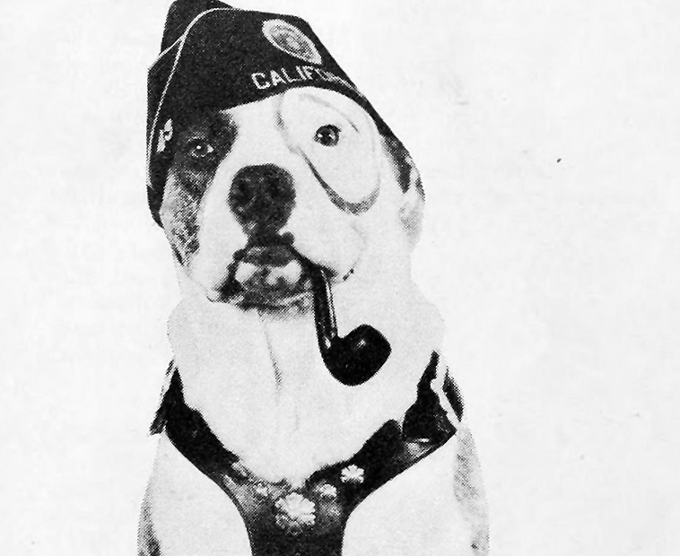 Born in 1925, Pal went on to star in a number of silent comedies before becoming a star, and then the unfortunate victim of a dark Hollywood mystery. Raised by Harry Lucenay, the American Pit Bull Terrier was bred for Hollywood, getting a cameo in Harold Lloyd’s The Freshman when he was just six months old. That same year he showed up as Tige in Educating Buster,one of the first two-reeler films in the Buster Brown franchise. Pal, who was born with a nearly complete ring around his eye–permanent dye was applied to complete the circle––made a striking addition to the classic comedy series. Pal went on to show up in more than 40 Buster Brown shorts before being picked by producer Hal Roach to play the dog in his Our Gang comedy series. Pal was immediately signed to a three-year contract with a starting salary at $125 per week. He went on to make 13 more Our Gang films before tragedy struck in 1930. Pal was murdered on set when he ate meat containing ground-up glass. No suspects were identified, and no one was brought to justice. The young actors in the series were heartbroken by the dog’s sudden demise. The Our Gang series continued with Pal’s son, Pete the Dog. To maintain continuity, the production team drew a ring around Pete the Dog’s eye to make him look more like his father.