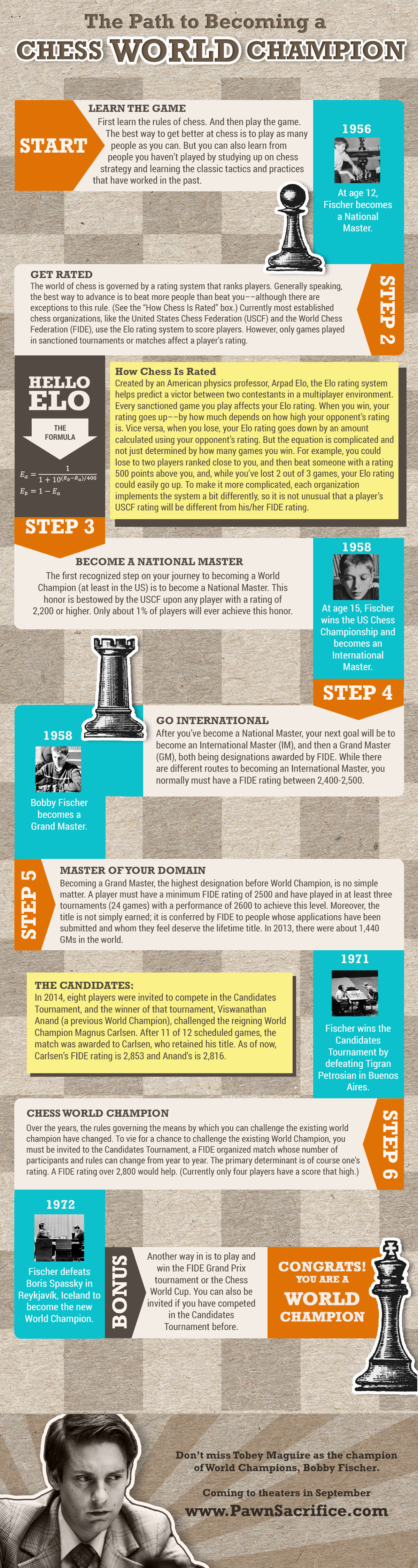 In the world of chess, there is no greater honor than becoming a World Champion. Bobby Fischer became the one and only American World Champion in 1972. While many players had boasted of the title since the game began, the title became an official designation in 1886 when Wilhelm Steinitz and Johannes Zukertort sat down to play a match which they, as well as other parties involved, agreed would determine the World Champion of chess. Since that auspicious match, which Steinitz won, there have been 19 other World Chess Champions. While the title remains the crown of the chess world, the path to it is complicated, arduous and forever changing.