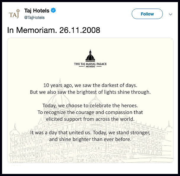 During the attacks, the Taj Mahal Palace Hotel was nearly destroyed with parts burned down and other sections demolished by bomb explosions. Refusing to be defeated, the Taj reopened part of the hotel for business by December 21, 2008, less than a month after the attack. The hotel marked the 10-year anniversary with a private ceremony, tweeting out, “Today, we choose to celebrate the heroes. To recognize the courage and compassion that elicited support from across the world.” Puneet Chhatwal, the managing director of the Indian Hotels Company, acknowledged at the same time, “I don’t think ten years is long enough to forget if one was ever to forget this dark moment in history.”