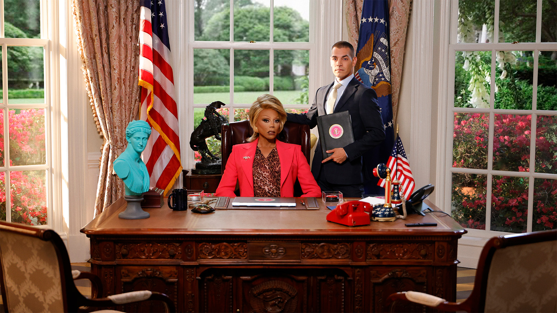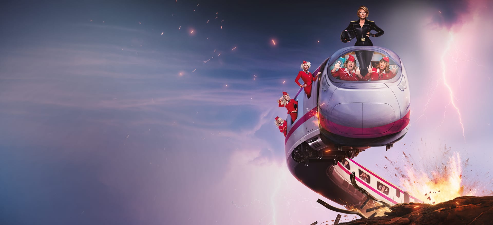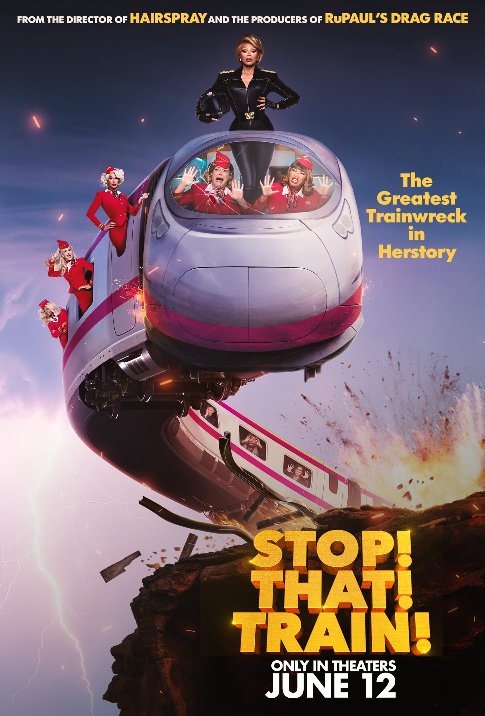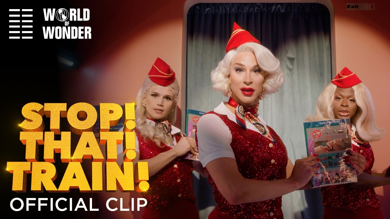 STOP! THAT! TRAIN! follows best friends Tess (Ginger Minj) and DeeDee (Jujubee), train stewardesses who trade their dreary shifts on the Stank Rail for the glitzy Glamazonian Express. When a catastrophic “Stormaganza” threatens to derail the high-speed train and crash it into Los Angeles, the duo in coach must join forces with the snobby first class attendants (Symone, Brooke Lynn Hytes, Marcia Marcia Marcia) and President Gagwell (RuPaul) to save the day in this wild ride of camp and comedy.